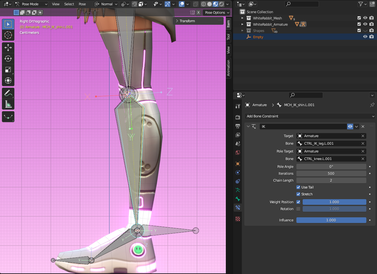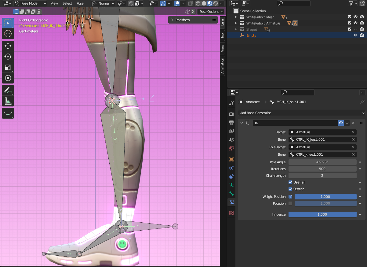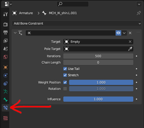 Back into Pose Mode, select the shin again and go to the Bone Constraint Properties. For Pole Target select Armature and for Bone, select the pole target one you just created. If you show the deform bones, you will see that the pole target rotated the IK a little.