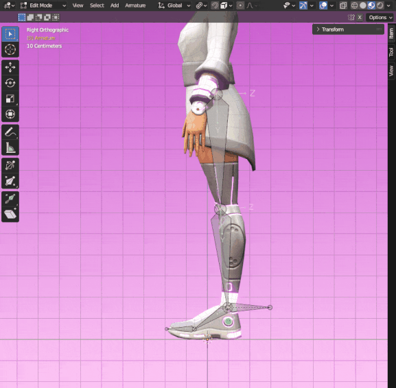 - Rotate the bone in X -90 (or 90, depending on the orientation you set) so it points forward and grab it in Y until it has a nice position in front of the leg. You can also scale it down a little bit.