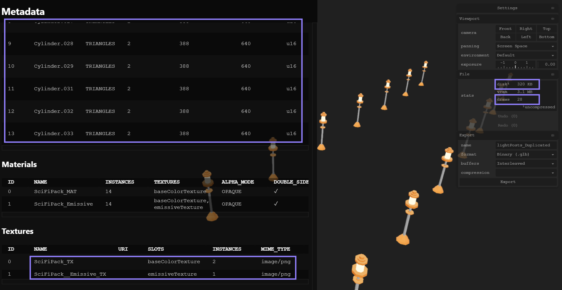 When we export these models, we will still have the same number of draw calls (28). However, note that we now have only one mesh, which significantly reduces disk usage (41 kb).