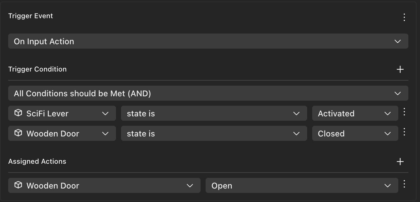 💡 Tip: Keep interactions between items simple. For example, avoid scenarios like having a button that opens a door by triggering three actions: play the door’s animation, play the door’s sound and change the door’s state. Instead, make the button change the door’s state. Then use an On State Change trigger so that the door itself handles playing the animation and sound whenever the state changes.