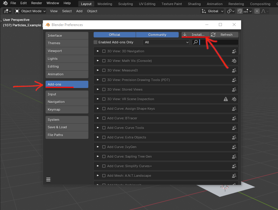 Next, you download and install the add-on. To do so, go to Edit > Preferences > Add-ons and click on Install to browse the file in your computer.