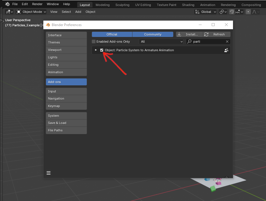 But since object animation and particle systems are not supported in Emotes 2.0, we need to convert these particles into an armature (which is supported) in order to add them to emotes. We’ll be using a Blender add-on developed by the Foundation’s Content Team for this process, which can be downloaded from the link below.