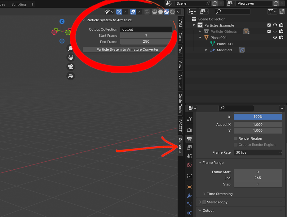 Next, select the object, go to the Converter tab, rename de Output Collection however you see fit, define Start and End Frames and click on Particle System to Armature Converter, as shown below.