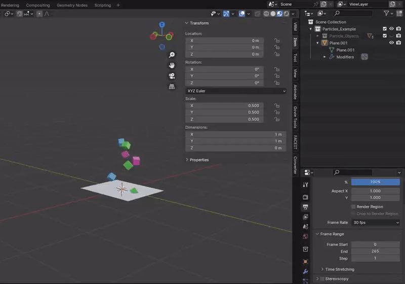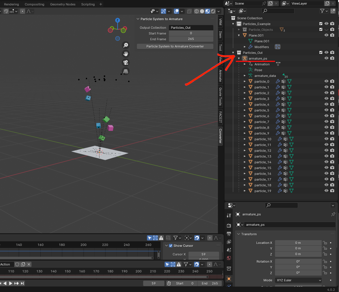 You will notice that a collection was created in the Outliner, with the particles armature. An animation clip was also created, by baking all the movement of each object.