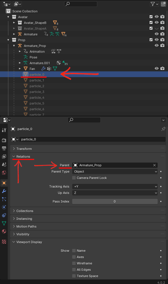 Once you do that, the particles might look messed up, but don’t worry, this is part of the process. To fix that, select each particle object on the Outliner one at a time, go into Object Properties (orange square icon) and under Relations, check if the parent is Armature_Prop. Do this for all particle objects. This means that all objects are child of Armature_Prop.