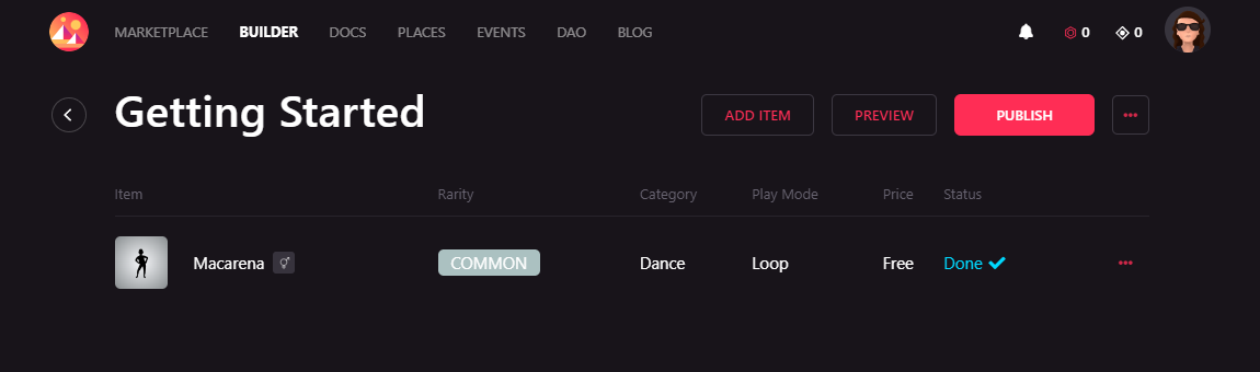 If the emote has sound (mp3 or ogg) it must be zipped with the .glb. After that, just drag and drop the .zip to the builder. Also, it is possible to add a .json file along with the other assets in the same .zip to add name, description, rarity, category, play mode and/or tags. These are the definitions for each: