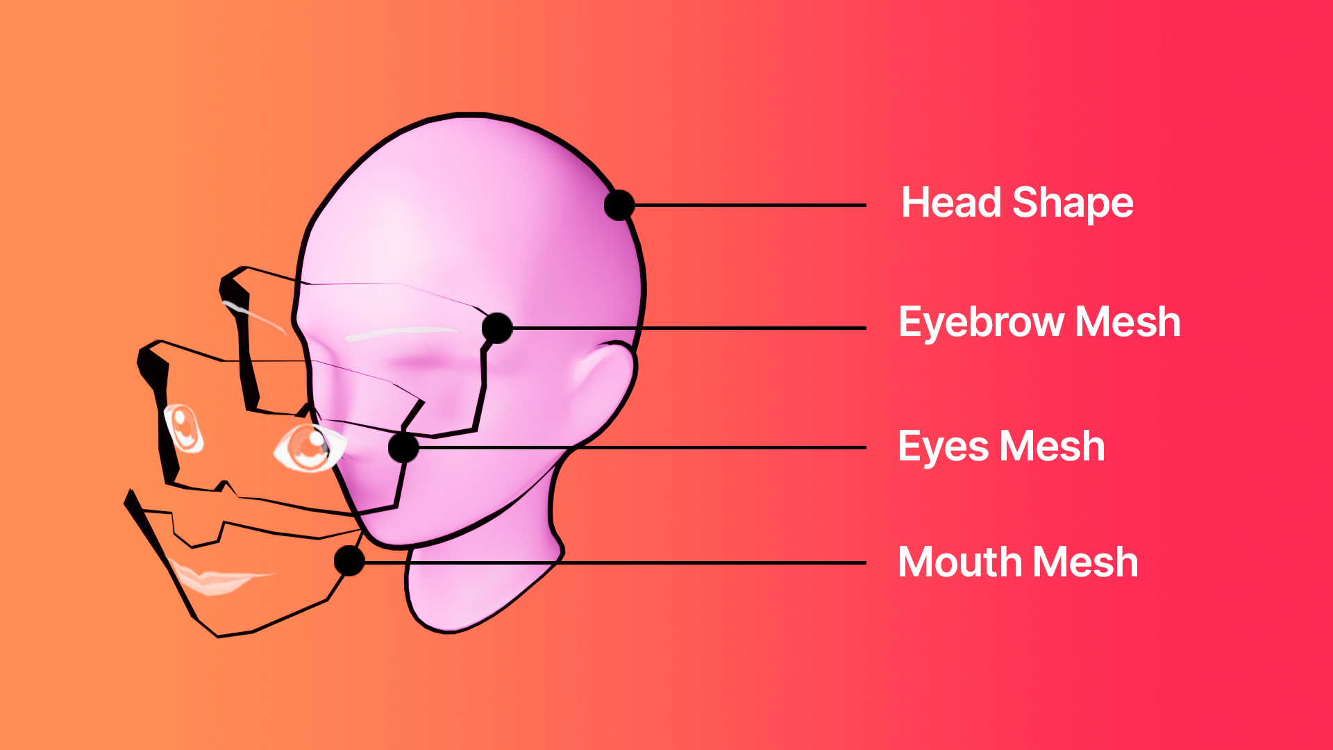 These meshes work with a transparent shader so you don’t have to do anything aside from creating your own png texture for the new eyebrow, eye, or mouth style you want and placing it correctly into the UV map. These textures should be 256x256px and need to have an alpha channel for transparency.