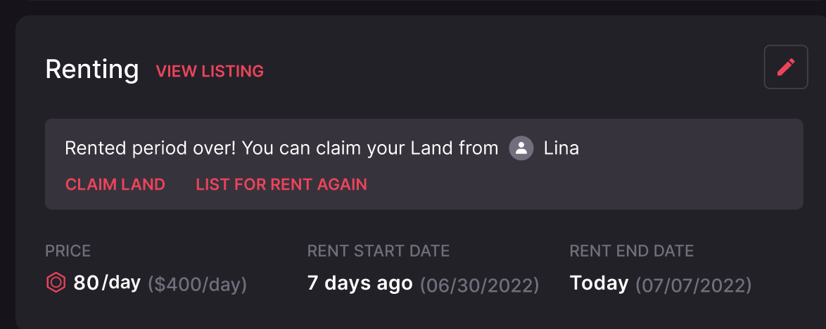 After the Rent is over, you can either Claim your LAND Back, or List it for Rent Again.